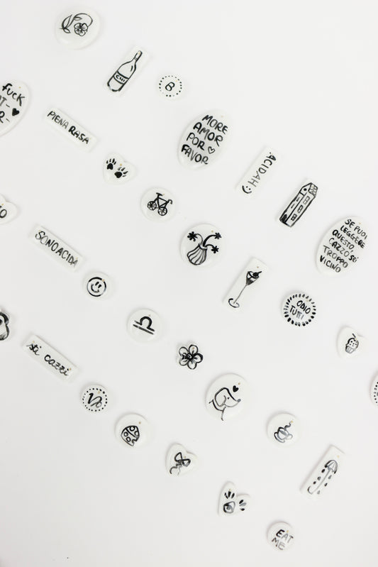 The pendants are made of polymer clay, hand painted with acrylic and resin. They are therefore resistant to shocks and falls and very light. The chains are steel or 18k gold plated brass.
